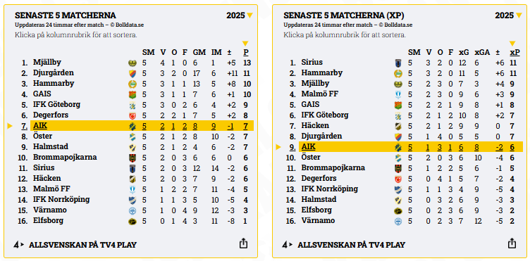 Hans analys kommer i en situation där AIK pressas av svaga resultat och ett kritiserat sommarfönster. Laget har tappat tredjeplatsen som ger kval till Europaspel och ligger nu fyra i tabellen. I formtabellen över de senaste fem matcherna återfinns AIK först på en sjundeplats, med sju inspelade poäng – svagare än samtliga konkurrenter i kampen om Europaplatserna utom Malmö FF.