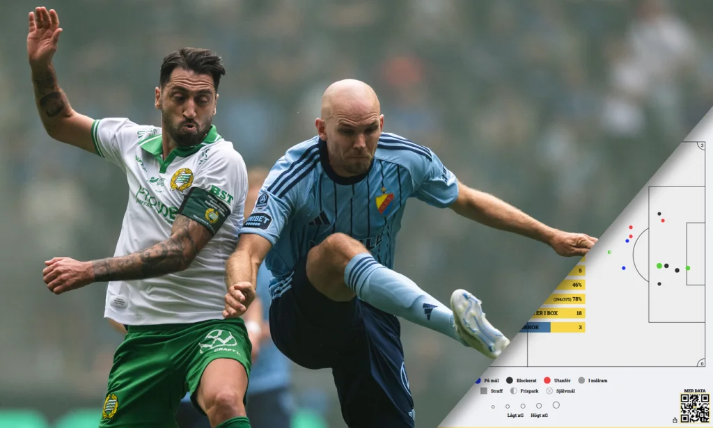 Söndagens derby mellan Djurgården och Hammarby slutade 3–3 – efter en dramatisk kvittering på övertid, där Djurgårdens Adam Ståhl satte matchens sista spark i mål. Men hur väl speglade det oavgjorda resultatet egentligen matchens händelser? Med hjälp av vår data- och statistikplattform Bolldata går det att granska matchbilden på djupet.
