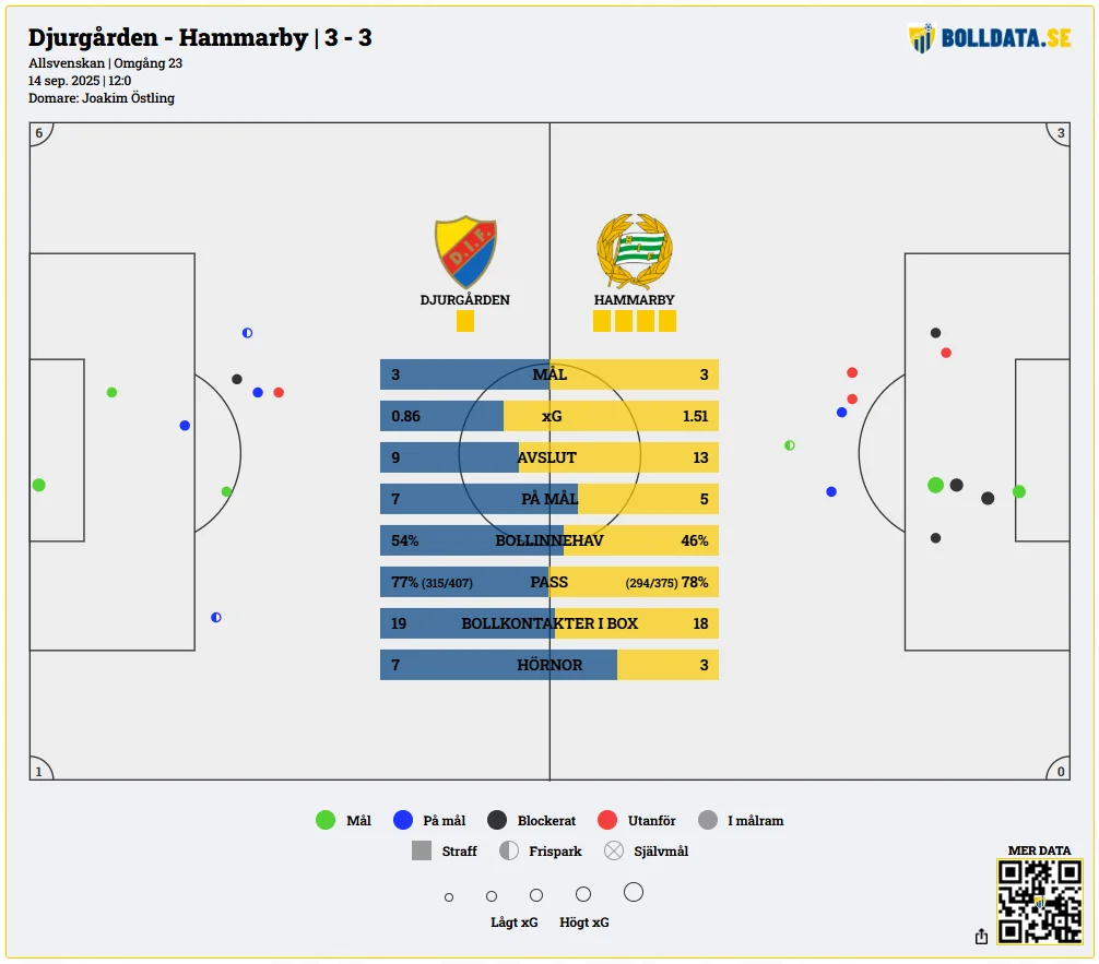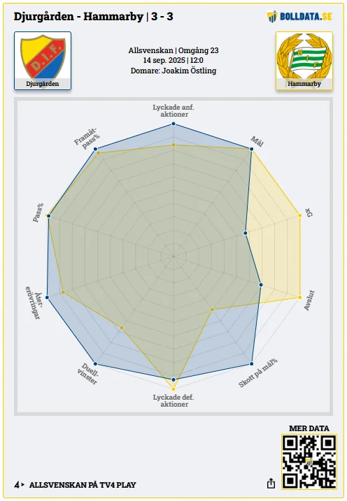 Sammanvägt visar statistiken att Djurgården hade ett övertag i flera områden, medan Hammarby skapade de något farligare chanserna. Det dramatiska 3–3-resultatet på övertid framstår därmed som som rimligt, sett till den underliggande statistiken. Klicka här för att komma till matchrapporten på Bolldata.