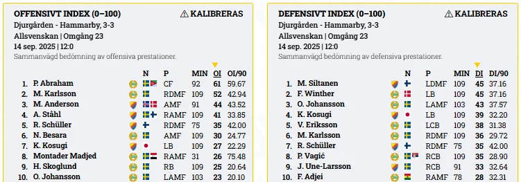 Våra prestationsindex gör en samlad bedömning av spelarnas offensiva och defensiva insatser. Enligt dessa var Paulos Abraham (Hammarby) matchens bästa offensiva spelare. Defensivt toppade Matias Siltanen (Djurgården) tillsammans med Frederik Winther (Hammarby).
