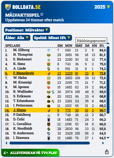 Under allsvenska säsongen 2025 spelade Manojlovic betydligt mer än Rinne. Serben hade därtill högre räddningsprocent än sin svenske kollega.
