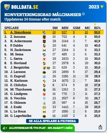 Sigurdsson hade under säsongen 2023 i Norrköping högst konverteringsgrad av samtliga spelare i serien, med fem spelmål på tio målchanser fördelat över 937 minuter.