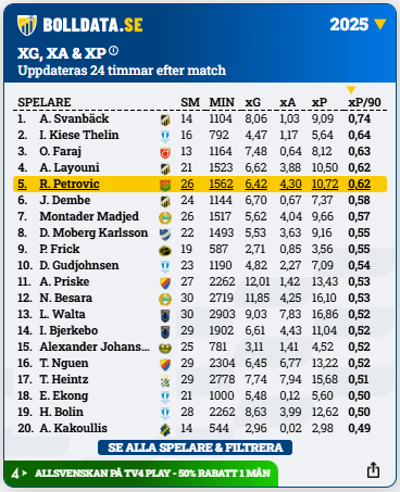 Rasmus Niklasson Petrovic förväntade poäng per 90 minuter under Allsvenskan 2025: