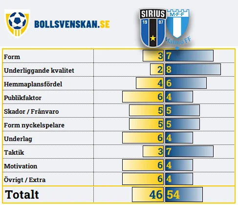Det finns mycket som talar för att omgångens första match kommer att bli en underhållande och målrik tillställning. Utöver att det historiskt sett brukar bli i snitt fyra mål per match när lagen möts i Uppsala, så är det två lag som vill ha mycket boll och gärna går på avslut. Förra omgången bjöd på hemmaseger för Sirius mot GAIS (3-1) samtidigt som Malmö förlorade med 2-1 borta mot Mjällby. Det är samtidigt nästan på dagen ett år sedan Malmö FF förlorade två raka allsvenska matcher så räkna med ett revanschsuget bortalag.