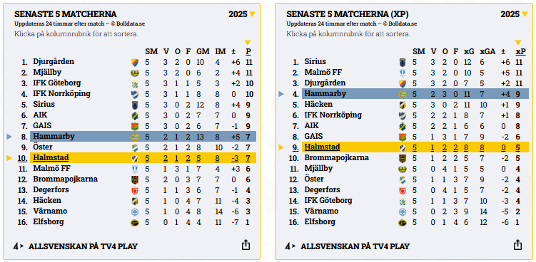 I formtabellen över senaste fem matcherna står båda lagen på sju poäng. Hammarby återfinns på åttonde plats, HBK på tionde. Sett till förväntade poäng (xP) senaste fem matcherna har Hammarbys spel varit starkare – nio poäng jämfört med Halmstads fem under samma period.