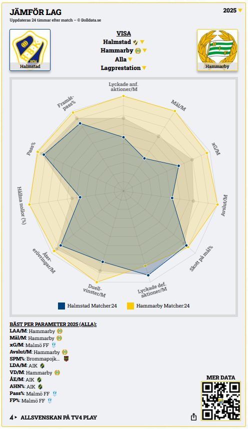 Hammarby reser till Örjans Vall med gulddrömmar i behåll och en skytteligaledare i toppform. Halmstad kliver in i mötet med en historisk vändning i ryggen och viktiga poäng på spel i bottenstriden. I artikeln finns formtabeller, lagjämförelse och aktuell truppstatus inför matchen.