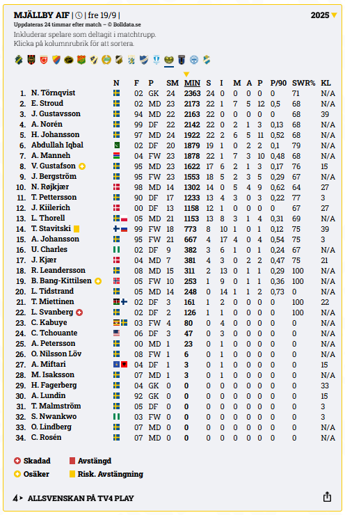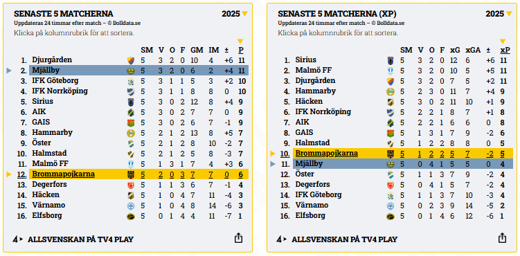 Formtabellen över förväntade poäng (xP) ger en något annan bild. Där återfinns Mjällby först på plats 11 med fyra poäng, medan BP placerar sig strax före på plats 10. Det visar att Mjällby fått bra betalt på sistone, särskilt med tanke på de starka resultaten på bortaplan.