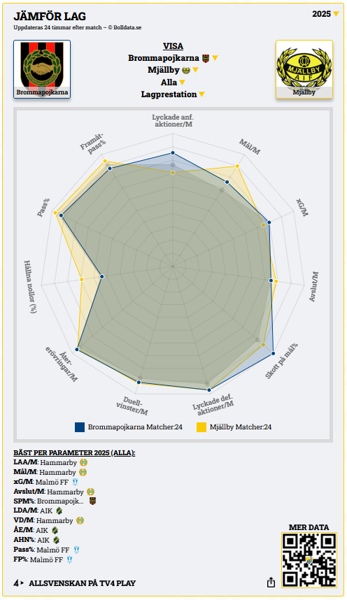 Mjällby AIF toppar allsvenskan med åtta poängs marginal och kliver under söndagen in på Grimsta med fem raka bortasegrar i ryggen. Brommapojkarna står för motståndet och kommer stärkta efter en meriterande seger mot IFK Göteborg. I artikeln hittar du formtabeller, aktuell truppstatus samt radardiagram som jämför lagen.