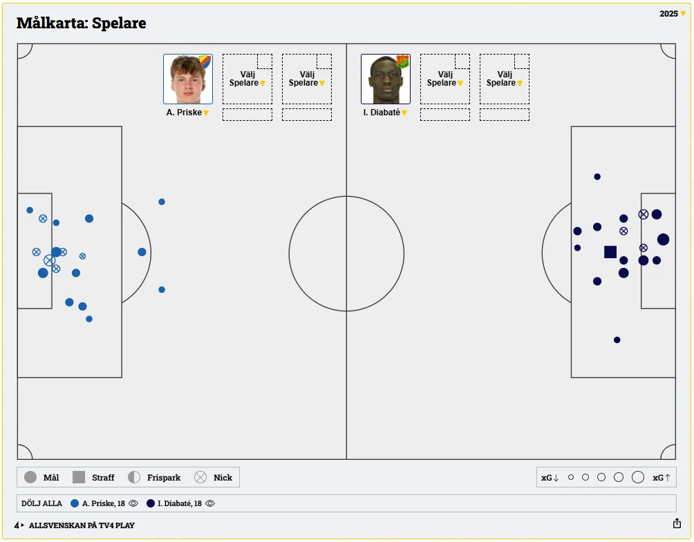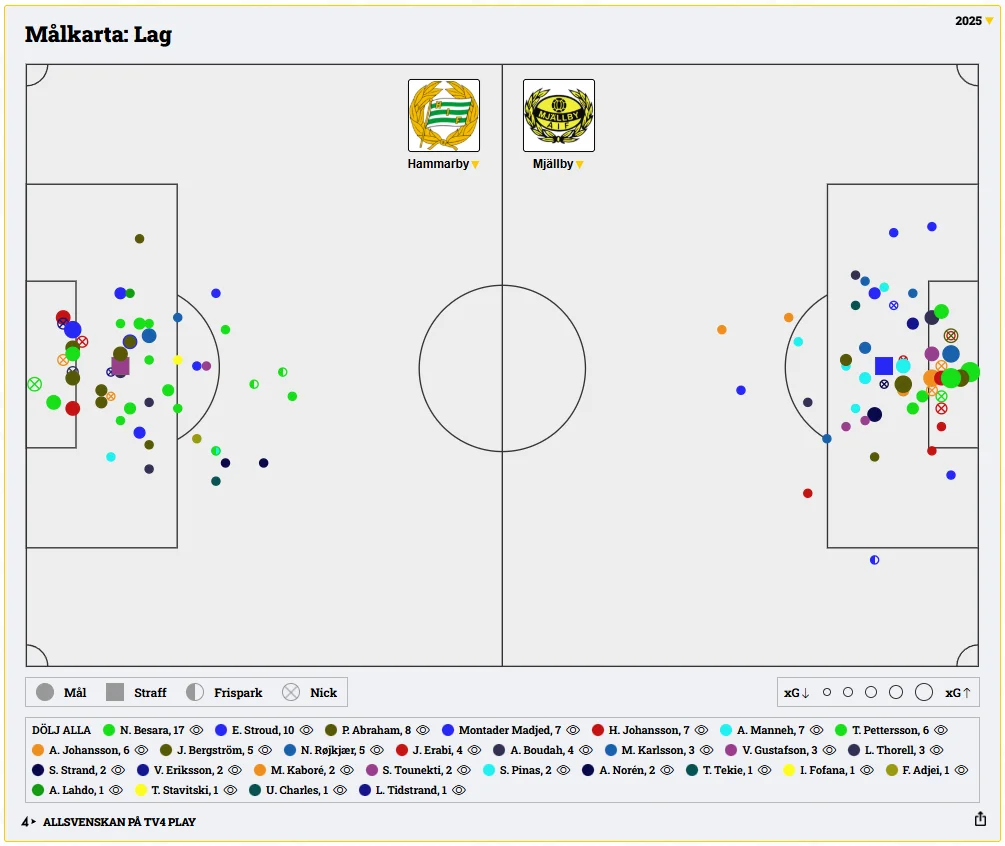 Bolldata introducerar nu interaktiva målkartor för alla spelare och lag i Allsvenskan. Verktyget ger en tydlig överblick över mål under en säsong och gör det möjligt att jämföra prestationer mellan spelare och lag.
