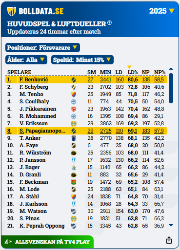 Benkovic var under 2025 den allsvenska försvarare som hade störst andel vunna luftdueller, med drygt 80%.