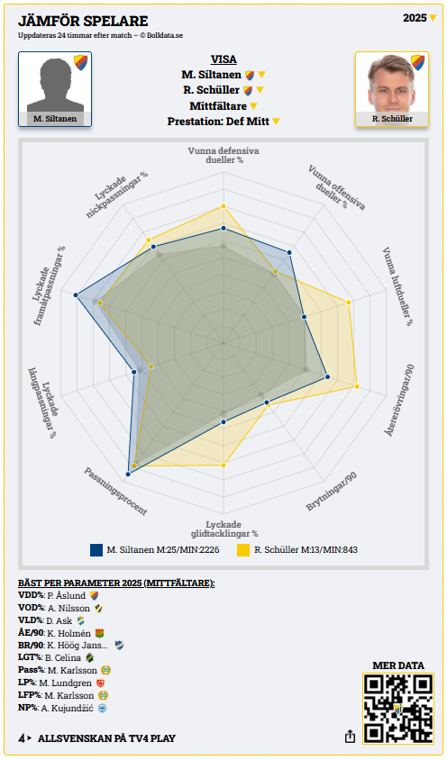 Mattias Siltanen vs Rasmus Schüller i defensiv mittfältsposition, Djurgården 2025.