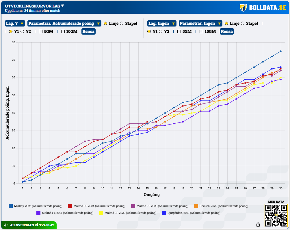 Mjällby slog allsvenskt poängrekord i samband med årets SM-guld. Med 75 poäng över 30 omgångar är man i särklass i en jämförelse mot övriga allsvenska seriesegrare i närtid. Grafiken nedan visualiserar Mjällbys poängskörd (mörkblå linje) under årets 30 omgångar, jämfört med vinnarna för föregående säsonger.