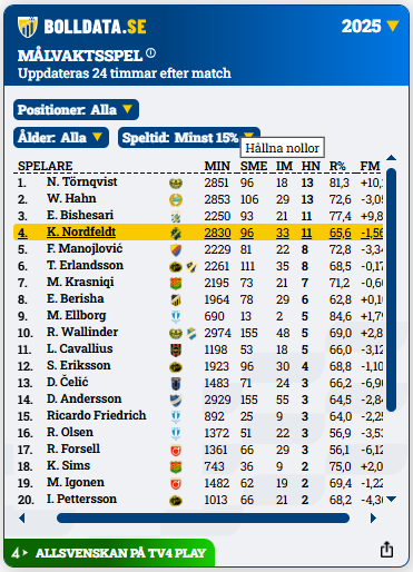 Nordfeldt höll nollan elva matcher under Allsvenskan 2025, vilket var tredje bäst i serien. Flest nollor höll Mjällbys tidigare målvakt Noel Törnqvist och Hammarbys Warner Hahn, 13 stycken vardera.