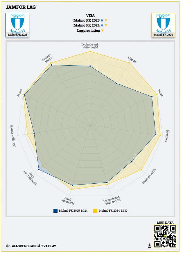Bolldata lanserar nu möjligheten att jämföra prestationer över flera säsonger med radardiagram – både för lag och spelare. Det öppnar för analyser som: hur stod sig Deniz Hummet i Djurgården 2024 jämfört med året innan i Kalmar, hur har Nahir Besara utvecklats över tid, eller hur skiljer sig Malmö FF:s prestation under guldåret 2024 från den aktuella säsongen.