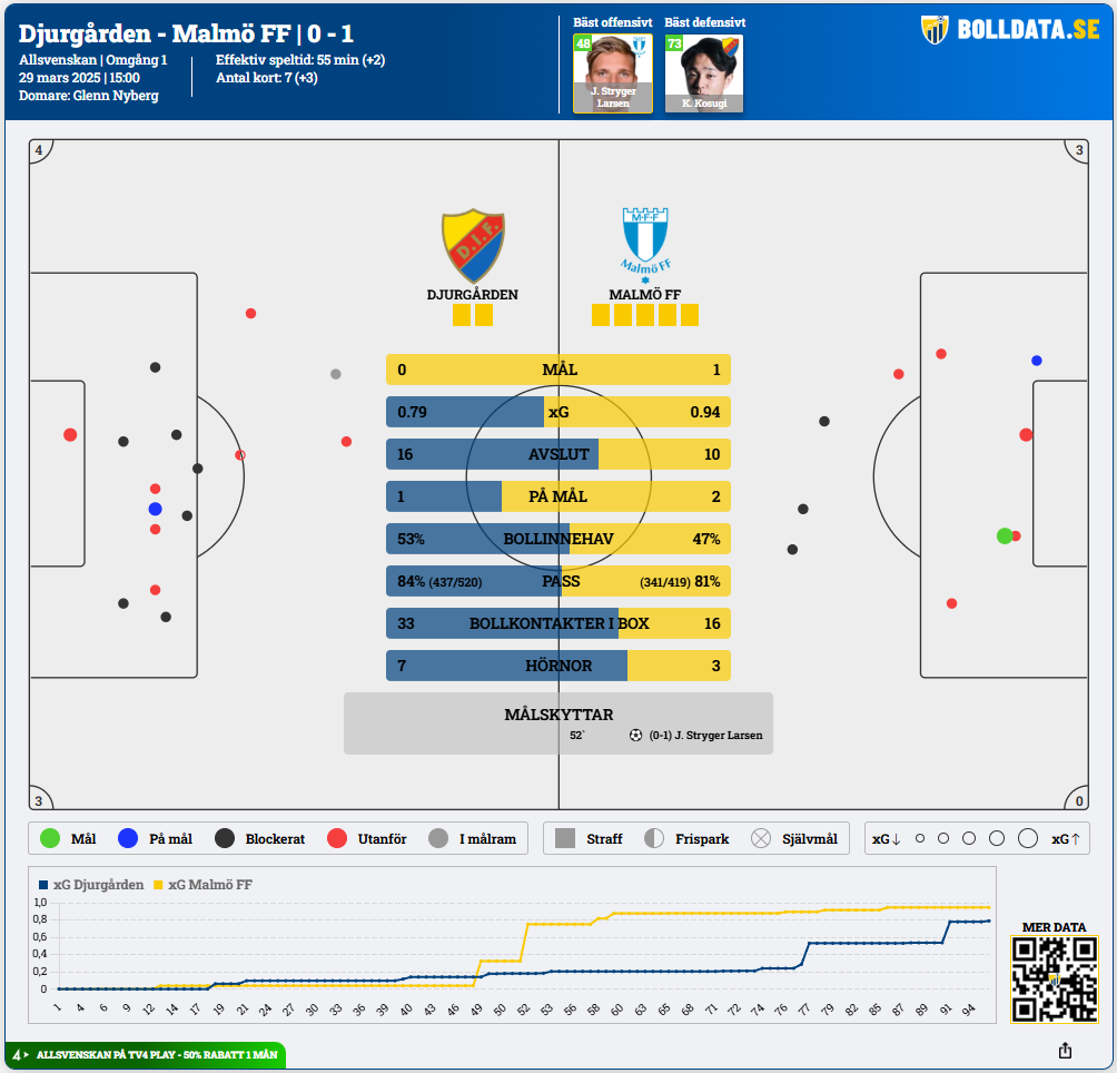 Sjöstrand gjorde även sitt första mål i MFF, medan Otto Rosengren fyllde på till 3–0 före paus.