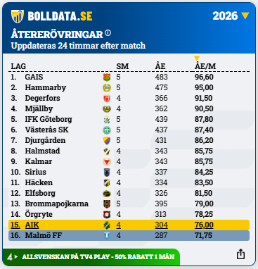 AIK och Malmö FF är i skrivande stund de två allsvenska lag som har minst antal återerövringar per match.