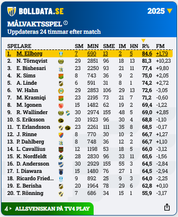 Melker Ellborg hade högst räddningsprocent av samtliga allsvenska målvakter under säsongen 2025.