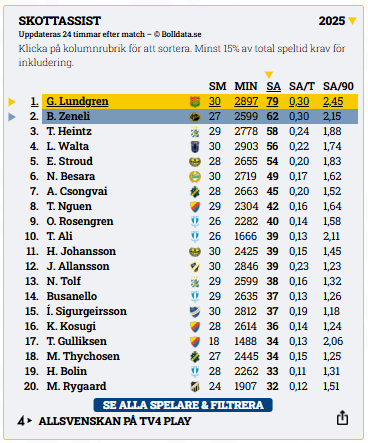 Gustav Lundgren och Besfort Zeneli slutade på plats ett respektive två i tabellen över de allsvenska spelare med flest skottassist under 2025.