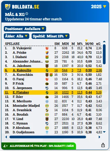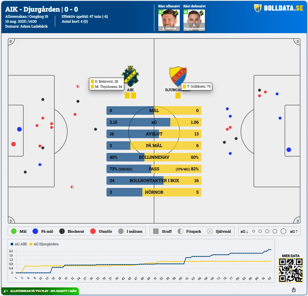När lagen möttes på Strawberry Arena i augusti förra året slutade matchen 0-0. AIK hade då ett övertag i xG, medan Djurgården hade fler avslut som träffade mål. Se hela matchrapporten från fjolårets möte här.