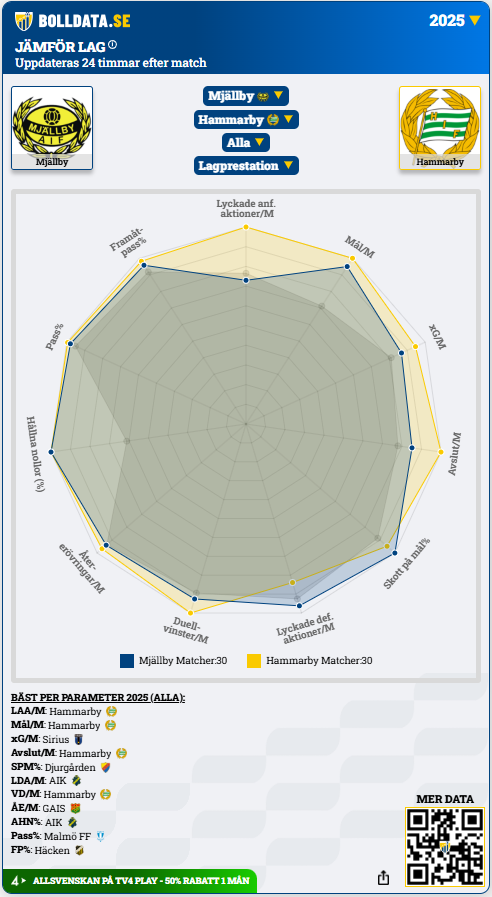 Hammarby premiärspelar mot Mjällby. Under Allsvenskan 2025 var Hammarby bättre än Mjällby på en rad statistiska parametrar, men Mjällby tog som bekant hem serien i överlägsen stil – mycket tack vare hög effektivitet.