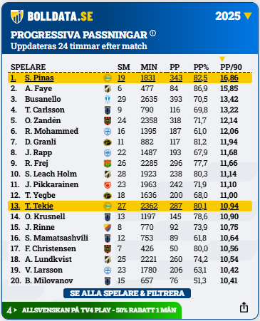 Progressiva passningar per 90 minuter, Allsvenskan 2025