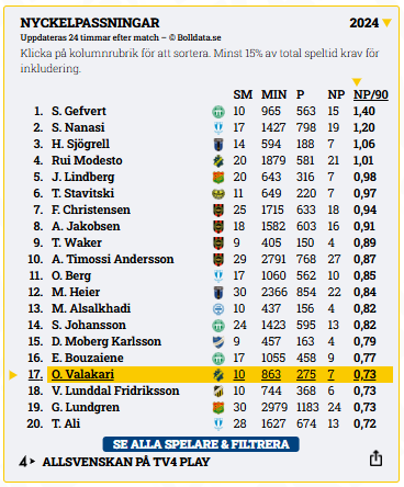 Nyckelpassningar per 90 minuter, Allsvenskan 2024
