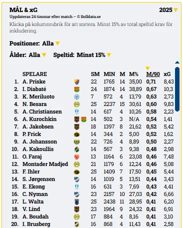 Med tre mål i Djurgårdens 8–2-seger mot Sirius står August Priske på 14 fullträffar efter 1 765 minuter. Snittet på 0,71 mål per 90 minuter är bäst i årets serie och tar honom förbi Nahir Besara, Kai Meriluoto och Ibrahim Diabate. Vi tittar även på hur siffrorna står sig mot de mest effektiva spelarna under tidigare år.