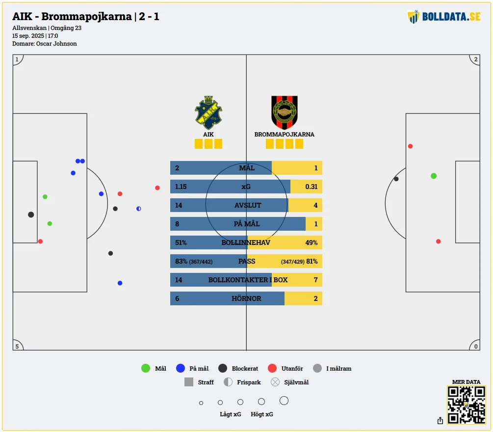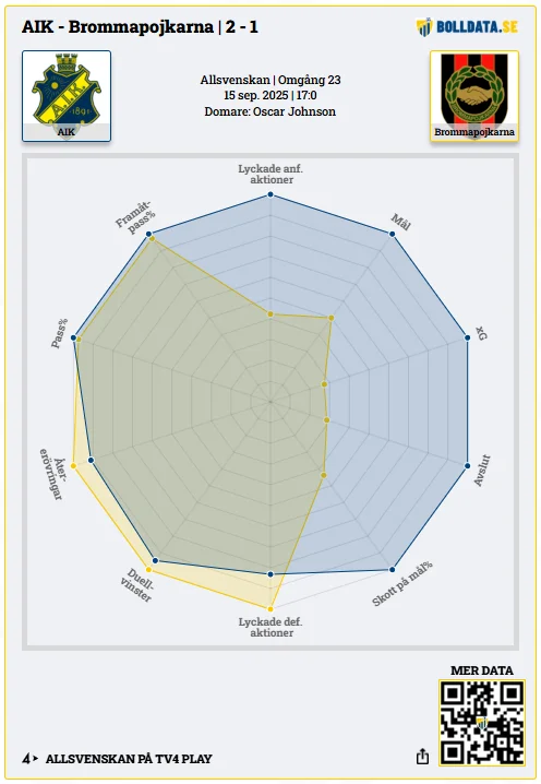 AIK:s 2–1-seger mot Brommapojkarna avgjordes i den 96:e minuten genom Kevin Filling. Men trots det sena avgörandet lämnar siffrorna inga frågetecken: statistiken visar att AIK var det klart bättre laget.