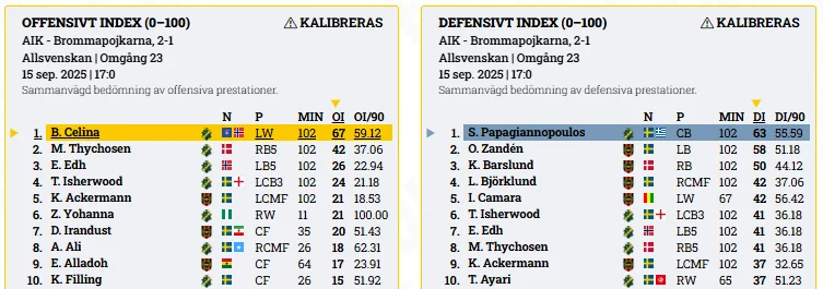 Enligt våra prestationsindex var Bersant Celina matchens främsta offensiva spelare, medan Sotirios Papagiannopoulos toppade den defensiva kategorin. Celina var även den spelare som samlade flest förväntade poäng (xP), totalt 0,76 fördelat på 0,17 i xG och 0,59 i xA. I faktiska poäng noterades han för en assist när han assisterade till Thomas Isherwoods ledningsmål i minut 35.