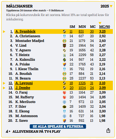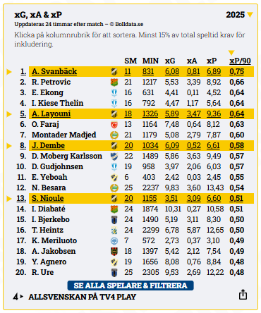 Häckens Adrian Svanbäck kommer till felst målchanser per 90 minuter av samtliga spelare i Allsvenskan. Han är även den spelare som har högst antal förväntade poäng (xP) per 90 minuter.