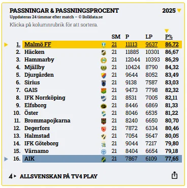 Tabelltrean Malmö FF har hittills den högsta totala passningsprocenten i serien med 86,7 procent, tätt följda av Häcken som också landar på 86,7 procent men marginellt bakom. I andra änden av tabellen återfinns AIK, vars passningssäkerhet ligger på 77,6 procent – lägst i Allsvenskan, och med marginal sämre än 2024 då laget hade en passningsprocent på 83,52%.