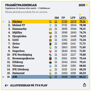 Efter 21 spelade omgångar framträder tydliga mönster i lagens passningsspel. Malmö FF och BK Häcken dominerar statistiken, medan AIK placerar sig längst ned i jämförelsen.