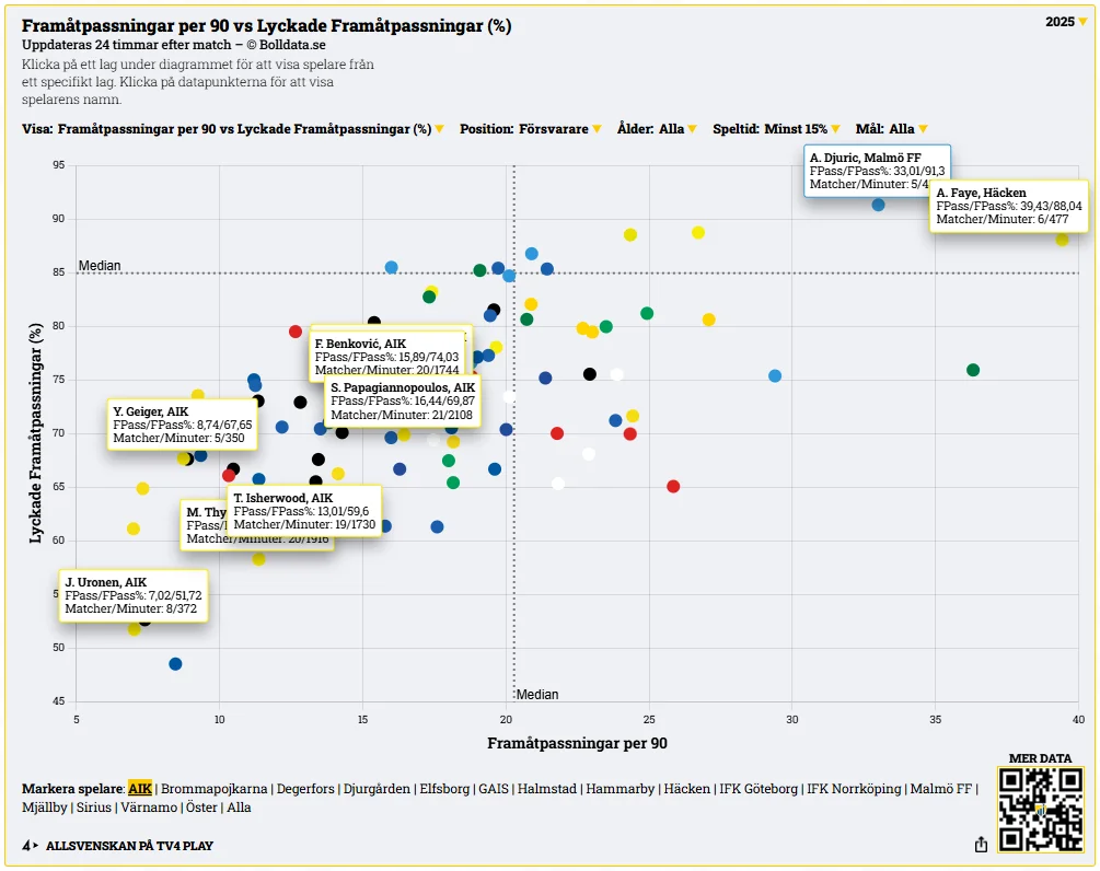 Kvaliteten i försvararnas framåtpassningar framträder tydligt i den illustrationen som följer. Ingen AIK-spelare återfinns i den övre högra kvadranten, medan Häcken och Malmö FF tillsammans upptar fem av de sex positionerna. Diagrammet nås här.