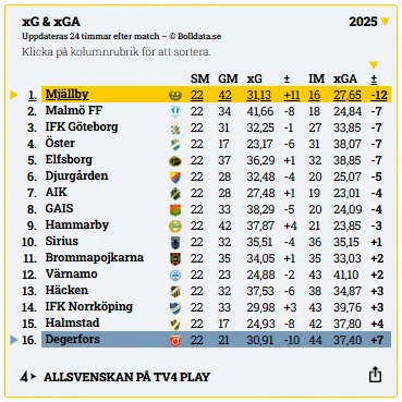 I motsatt ände hittar vi Degerfors, som är nästjumbo i den allsvenska tabellen. Där har man släppt in 44 mål trots ett xGA på 37 – en negativ differens på sju mål.