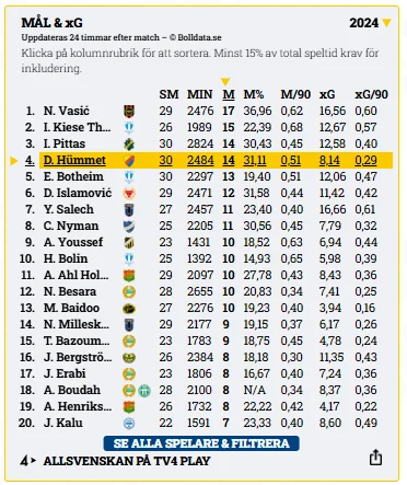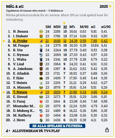 Hümmet avslutade fjolåret på 14 mål, fjärdeplats i den allsvenska skytteligan, och betraktades som en av seriens mest pålitliga målskyttar. Priske är redan nära de siffrorna – men det mest anmärkningsvärda är att hans underliggande statistik pekar på en ännu högre nivå.