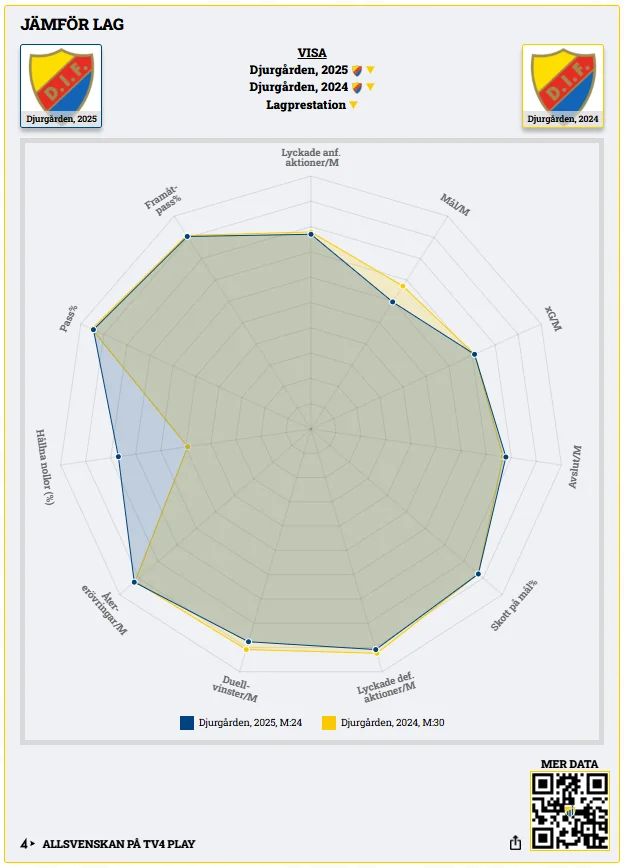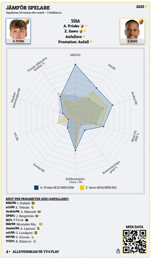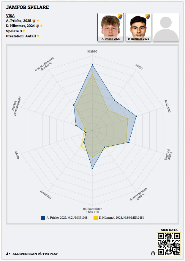 I sju av tio centrala offensiva parametrar är Priske starkare än Hümmet. Detta i ett Djurgården som totalt sett producerar färre mål per match än man gjorde 2024, då Hümmet var intern skytteligavinnare.