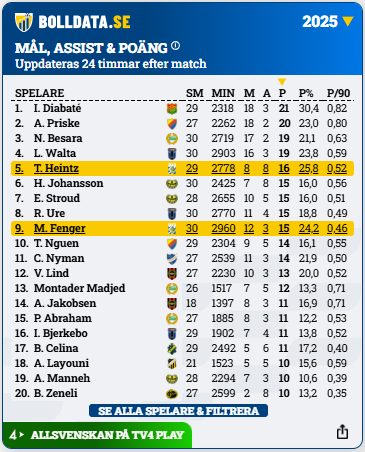 *Assist beräknas enligt internationellt vedertagen modell – kan skilja från officiella svenska siffror.