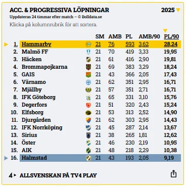 Hammarby dominerar Allsvenskan när det gäller progressiva löpningar. Stockholmslaget har med marginal de överlägset högsta siffrorna i serien per 90 minuter, medan Halmstad och AIK återfinns i botten med en mer restriktiv spelstil.