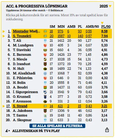 Tounekti, som inför säsongen värvades från norska Haugesund och redan nu uppges vara aktuell för en flytt till Celtic, toppar ligan med hela 140 progressiva löpningar – en klar marginal ner till övriga. Madjed placerar sig tvåa med 93, men hans mer begränsade speltid för honom upp i topp när vi mäter progressiva löpningar per 90 minuter.