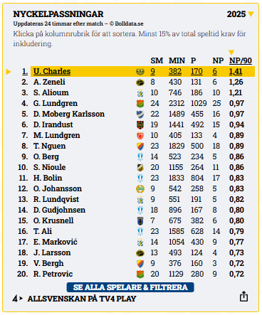 Mjällbys wingback Uba Charles toppar statistiken för nyckelpassningar per 90 minuter i Allsvenskan med ett snitt på 1,41. Närmast bakom följer Elfsborgs Arber Zeneli på 1,26.