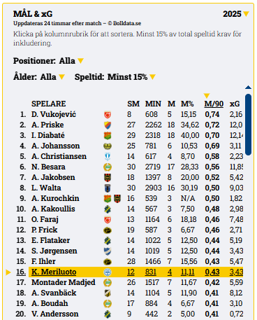 Med fyra mål på 831 minuter placerar sig Kai Meriluoto på 16:e plats i antalet mål per 90 minuter i Allsvenskan.