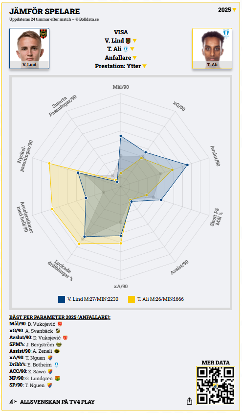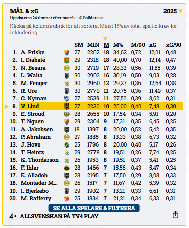 22-årige dansken Lind har under säsongen 2025 gjort tio mål och fyra assist i Allsvenskan.