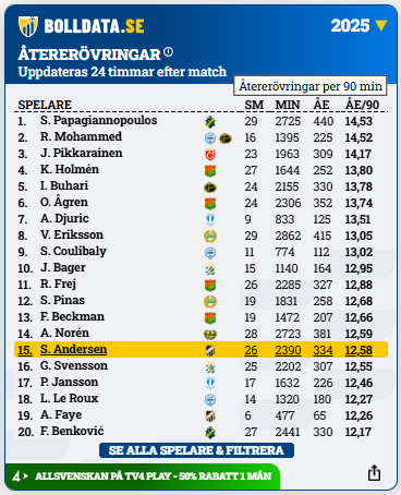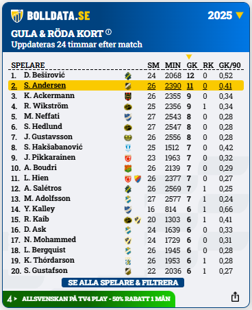 Andersen varnades näst flest gånger av samtliga spelare i Allsvenskan under förra säsongen.