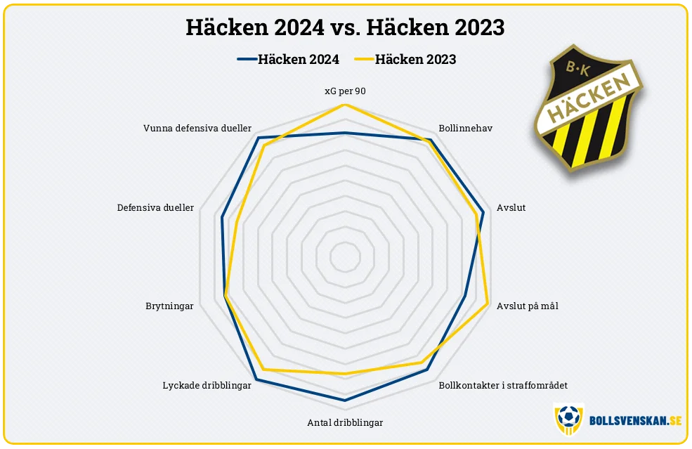 Att ersätta både en tränare och flera nyckelspelare inom loppet av ett halvår är utmanande för de flesta lag. BK Häcken har tvingats till det och även om vi känner igen lagets spelstil från tidigare säsonger så har det sportsliga resultatet sviktat. Laget ligger på en sjätteplats i tabellen med 20 poäng efter 13 omgångar, att jämföra med de 28 poäng man hade efter lika många spelade omgångar 2023.