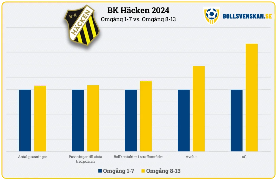 Fler passningar slås överlag, de hittar in i den sista tredjedelen och det ger fler bollkontakter i straffområdet, avslut och således en nästan dubbelt så hög xG. Samtliga siffror är baserade per 90 minuter och gör att det inte påverkar att den första perioden (omgång 1-7) innehåller en match mer än den senare. Tvärtom är det imponerande att laget visar upp de siffrorna när den andra halvan innehåller matcher där man tagit emot Malmö FF och AIK på hemmaplan samt mött tuffa motståndare i form av GAIS och Mjällby på bortaplan.
