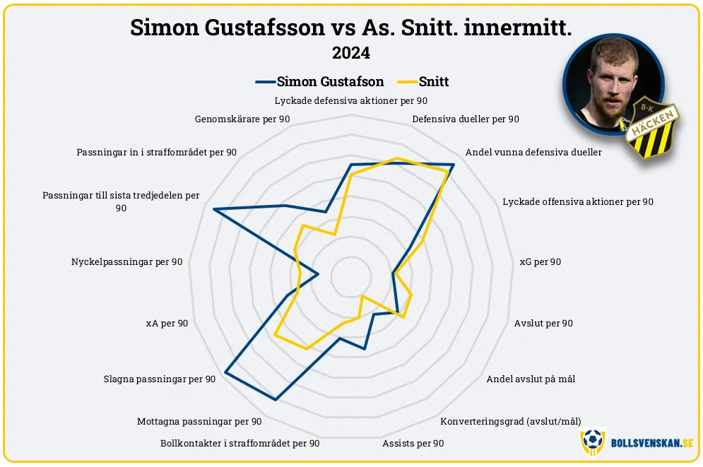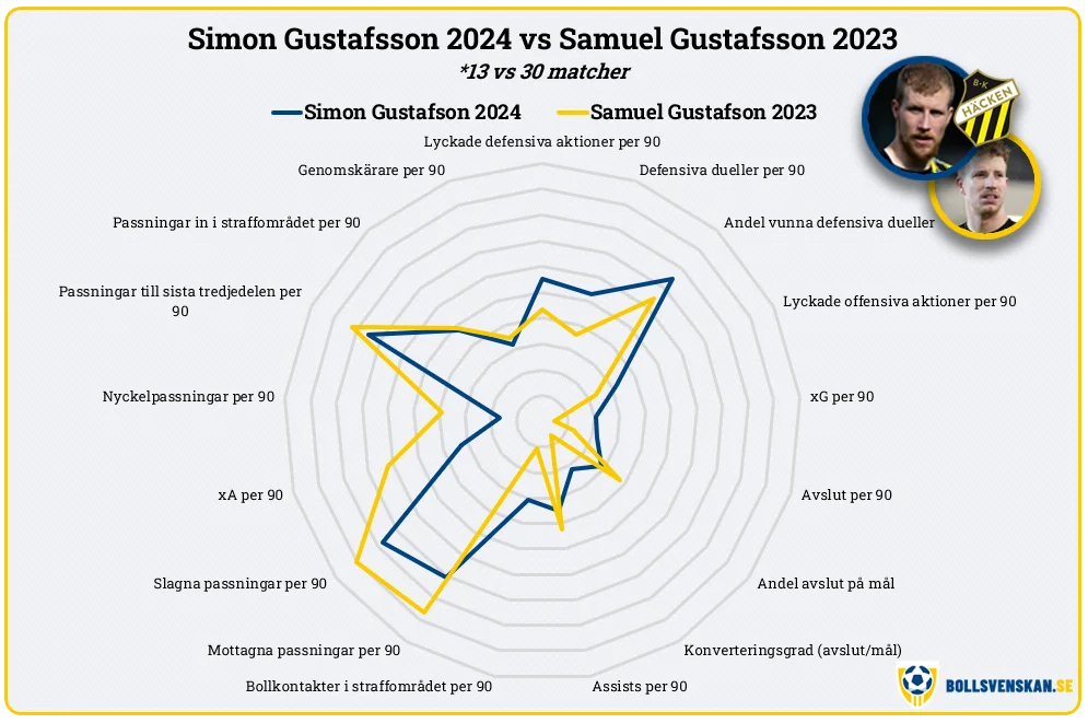 Ställer vi bröderna mot varandra ser vi att Samuel var mer involverad i Häckens spel än vad Simon är samt att både xA (förväntade assist) och nyckelpassningar väger över till Samuels fördel. Simon å sin sida är den defensivt starkare av de två med flera lyckade defensiva aktioner och vunna defensiva dueller. Värt att notera är dock att Samuel Gustafsons siffror baseras på hela 2023 medan Simons siffror bygger på ett underlag som är omgång 1-13 i år.