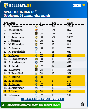 Speltid 2025, spelare födda tidigast 2007: